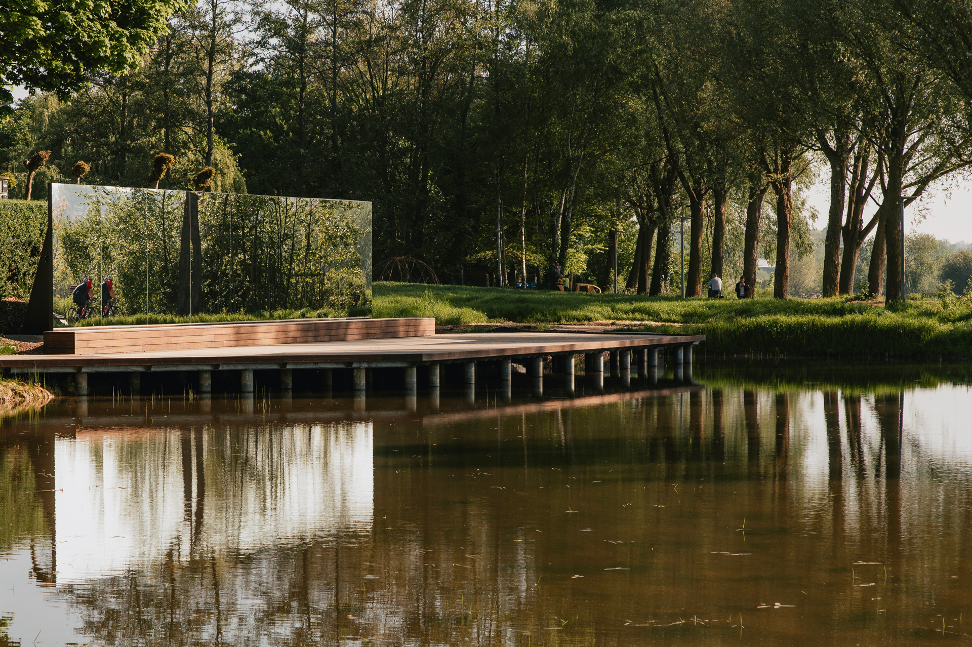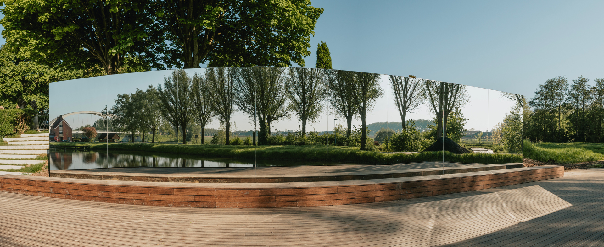 Con Happily Ever After, Rachel Valdés presenta una obra que desarticula las formas convencionales de ver y habitar el espacio público. Utilizando grandes planos espejados, la artista genera un dispositivo perceptual que altera la relación entre el espectador, la arquitectura y el paisaje urbano. La instalación fue originalmente concebida para el Malecón de La Habana durante la XI Bienal, donde dialogaba con el mar como símbolo de infinitud, frontera y deseo. En su nueva ubicación en la ciudad de Kortrijk, la obra renace con una resonancia distinta pero igualmente poética.