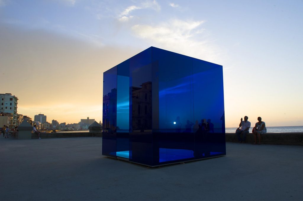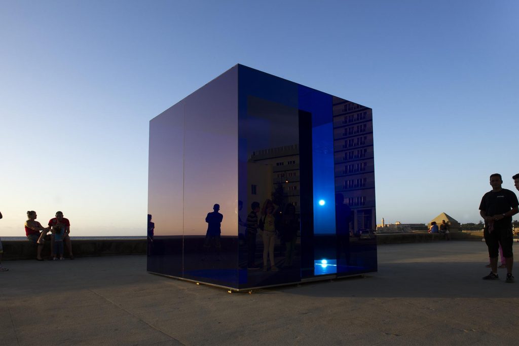 Presentado por primera vez en la XII Bienal de La Habana, el “Cubo Azul” de Rachel Valdés es una instalación inmersiva que funciona como un espacio de contención y expansión sensorial. Con dimensiones de 3 metros cúbicos y construido con espejo de seguridad laminado, estructura de acero inoxidable y láminas de cristal, esta obra se erige como un objeto meditativo en medio del espacio urbano. Una experiencia de disolución perceptiva.