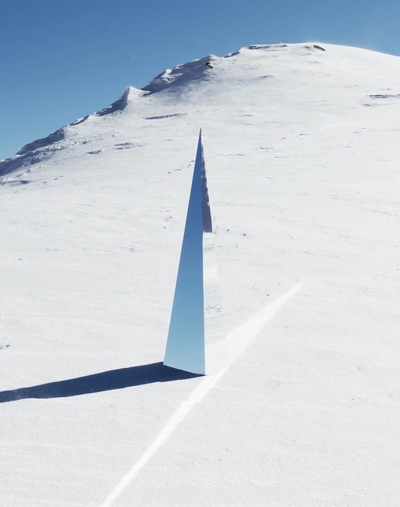 Esta obra explora la relación de las personas con el paisaje y los elementos naturales. Con una estética minimalista y una ejecución que conecta con el movimiento Art Land, Rachel Valdés creó un volumen geométrico con forma de pico ascendente utilizando planchas de acero. El acabado pulido y brillante de la superficie del material crea un efecto espejo interviniendo en la percepción del espacio natural.